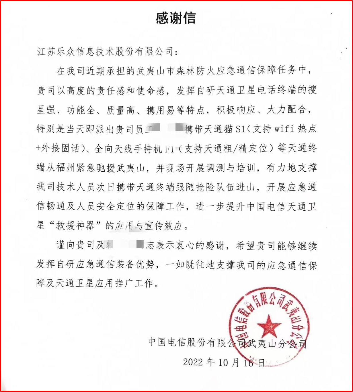 乐众信息技术股份有限公司相关领导,在收到省电信公司提出支撑需求后,迅速委派工作专业人员携带天通猫S1(支持wifi热点+外接固话)、全向天线手持机F1(支持天通粗/精定位)等天通终端从福州紧急驰援武夷山,并现场开展调测与培训,有力地支撑电技术人员次日携带天通终端跟随抢险队伍进山,开展应急通信畅通及人员安全定位的保障工作。我司的产品和员工得到中国电信股份有限公司武夷山分司的肯定和感谢。