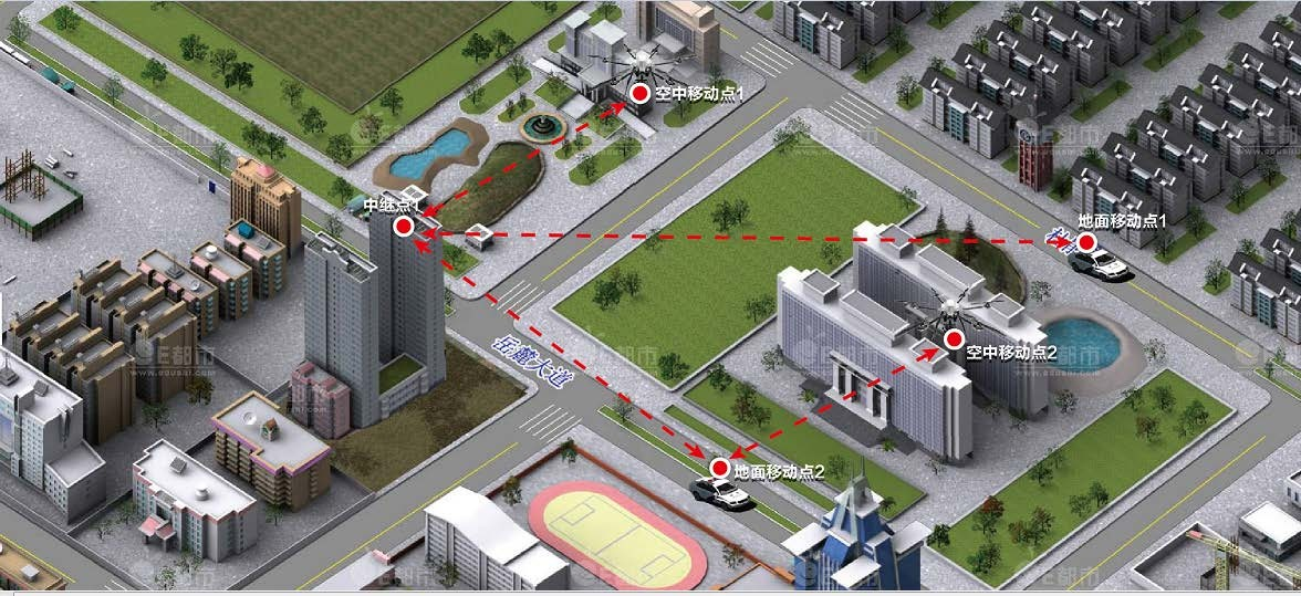 1) The aerial mobile point drone is equipped with a Mini Mesh radio station, which can be used as a high-point relay to achieve coverage within 5Km around, and can also be used as a video collection source to return images to the temporary command center.