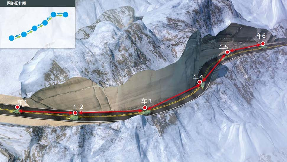In the practical application of the urban environment, due to the complex terrain and many turns, the vehicle in front (escort vehicle 1) and the command vehicle cannot form a "one-hop" direct connection mode. At this time, as long as escort vehicle 1 can maintain communication with escort vehicle 2, the system can automatically adjust to the relay routing transmission mode. As shown in the figure below, escort vehicle 1 transmits information to the command vehicle through "two hops".