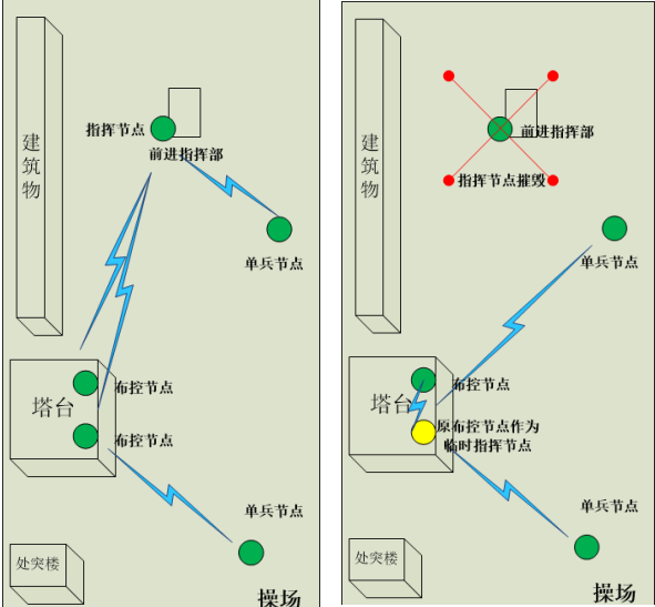 ▶ Individual soldier nodes: 2 individual soldier nodes are arranged in the playground for mobility, and the farther individual soldier nodes are sent back through a control node relay.